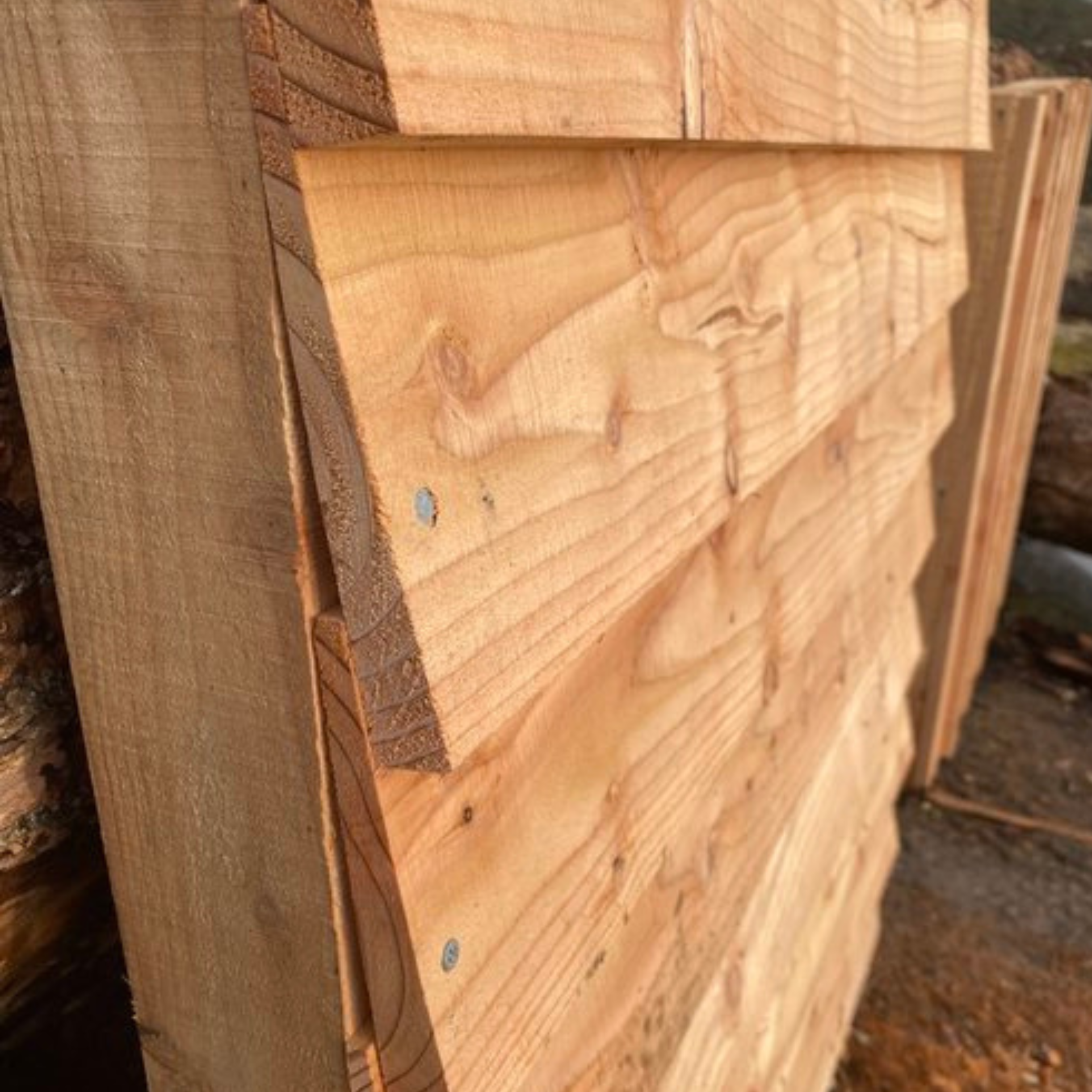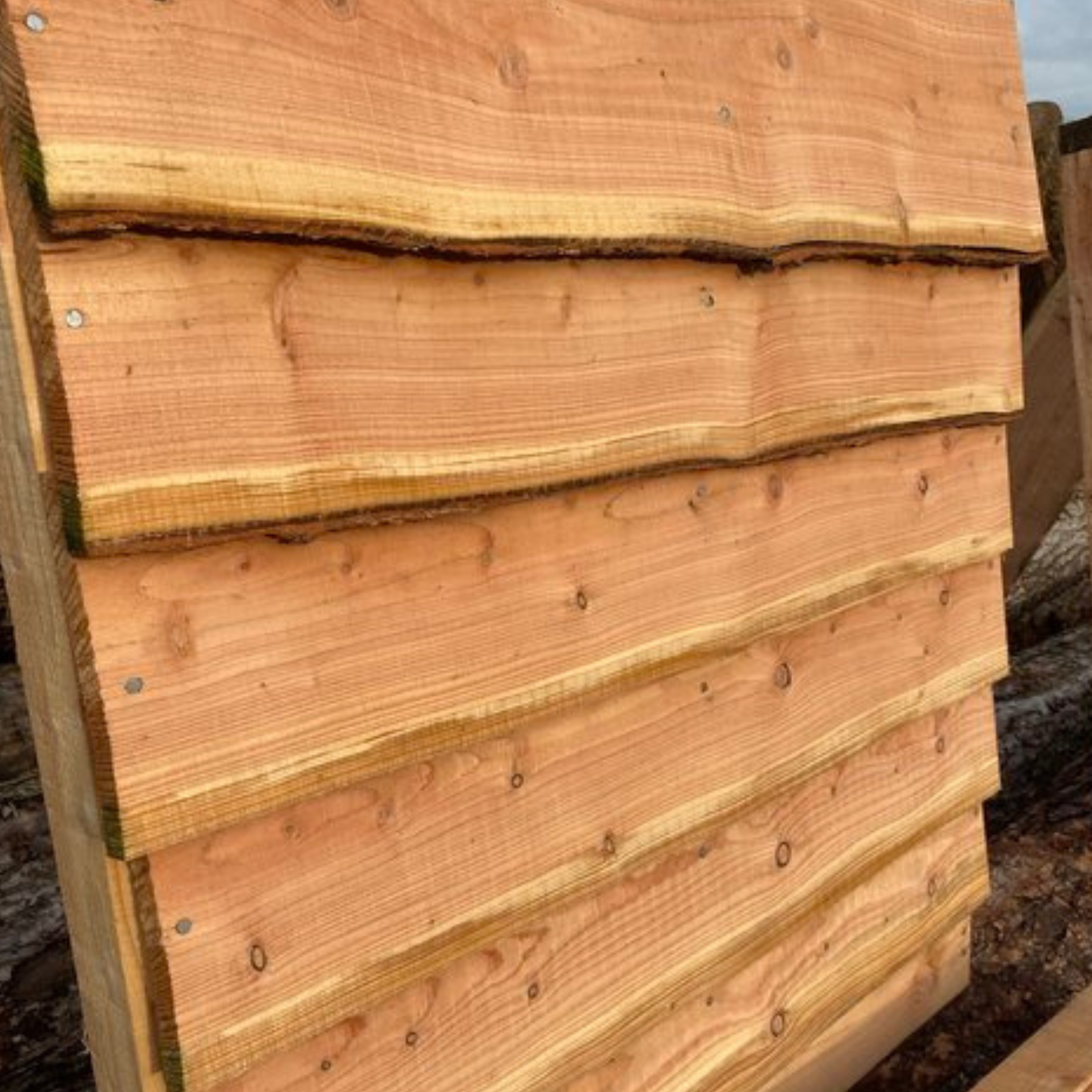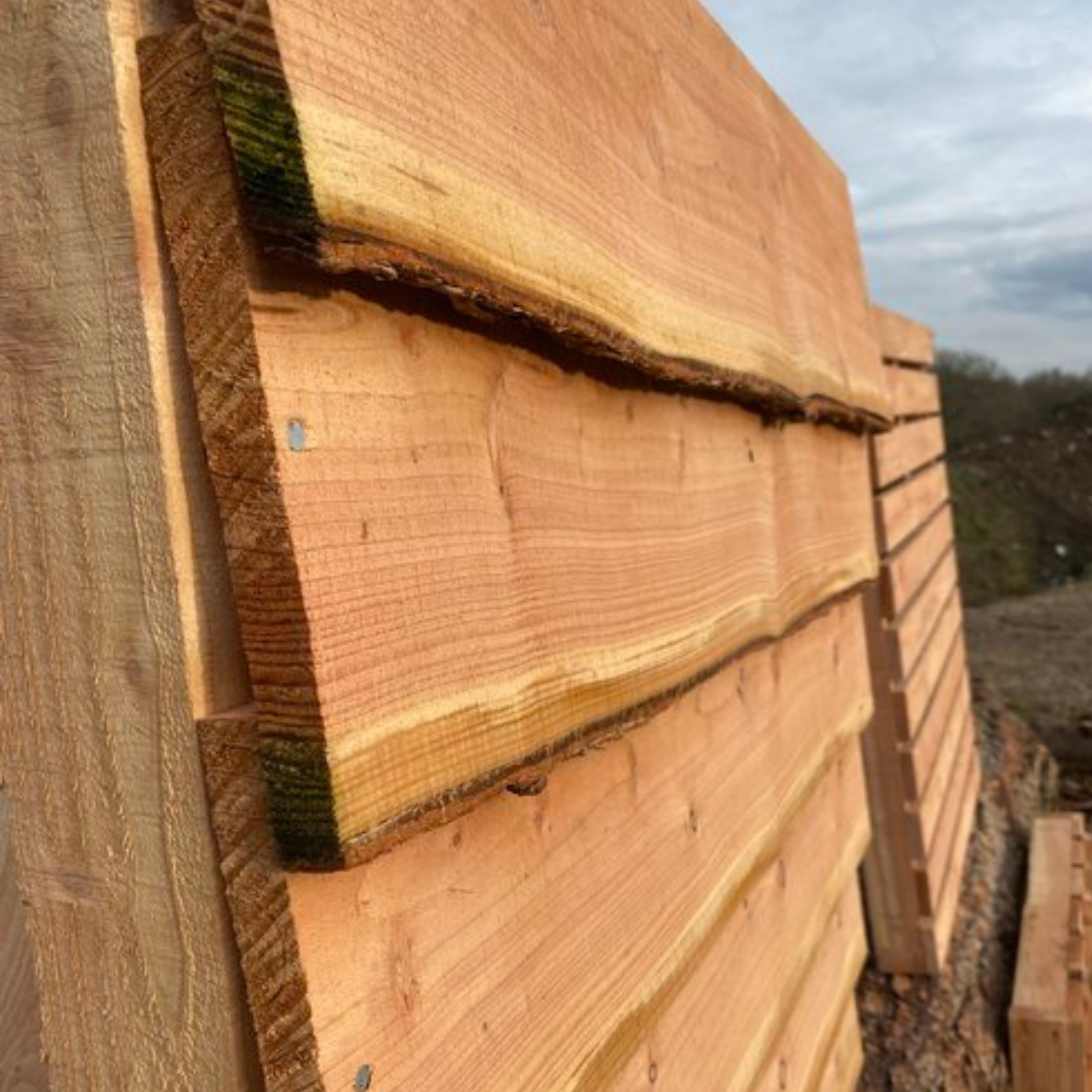 A horzontal cladding made with one square edge and one live edge 20mm thick and varying widths depending on the size of log. Like featheredge this is fitted with an overlap. Waney edge adds character and a rustic feel to your project.