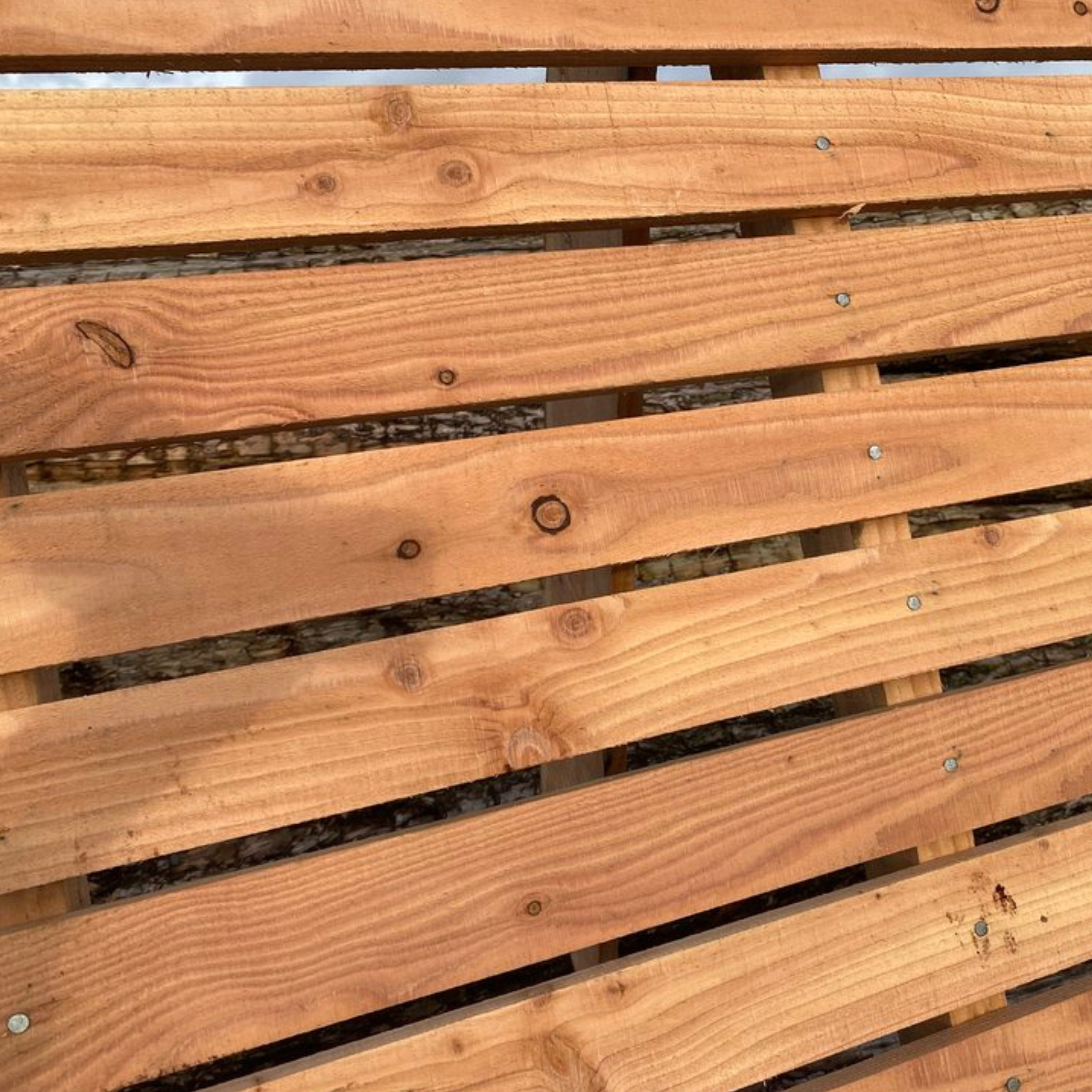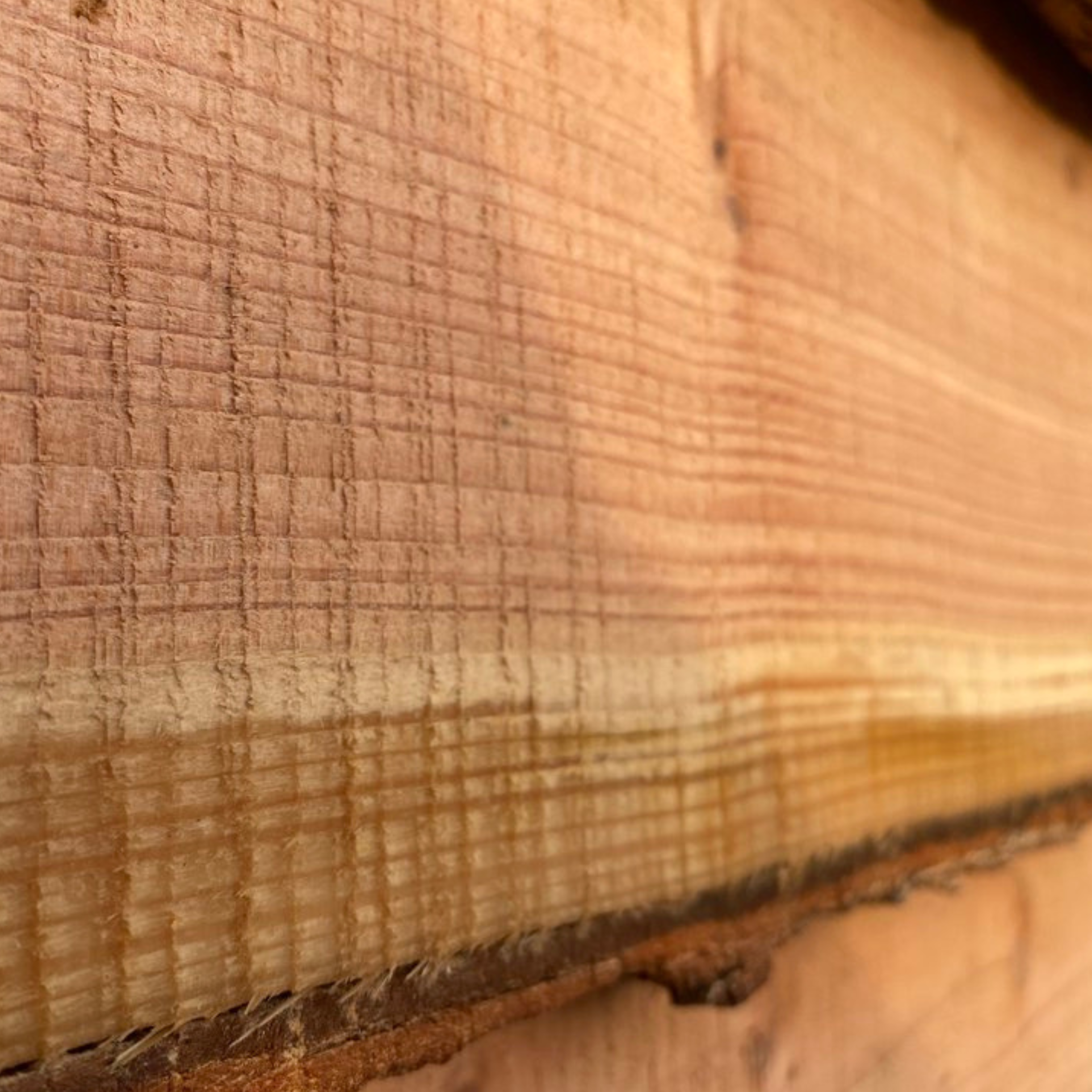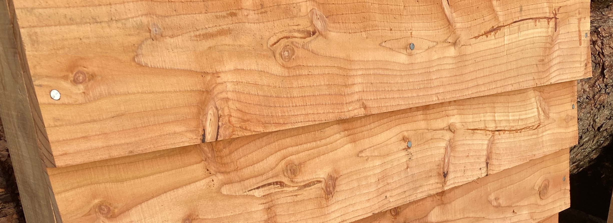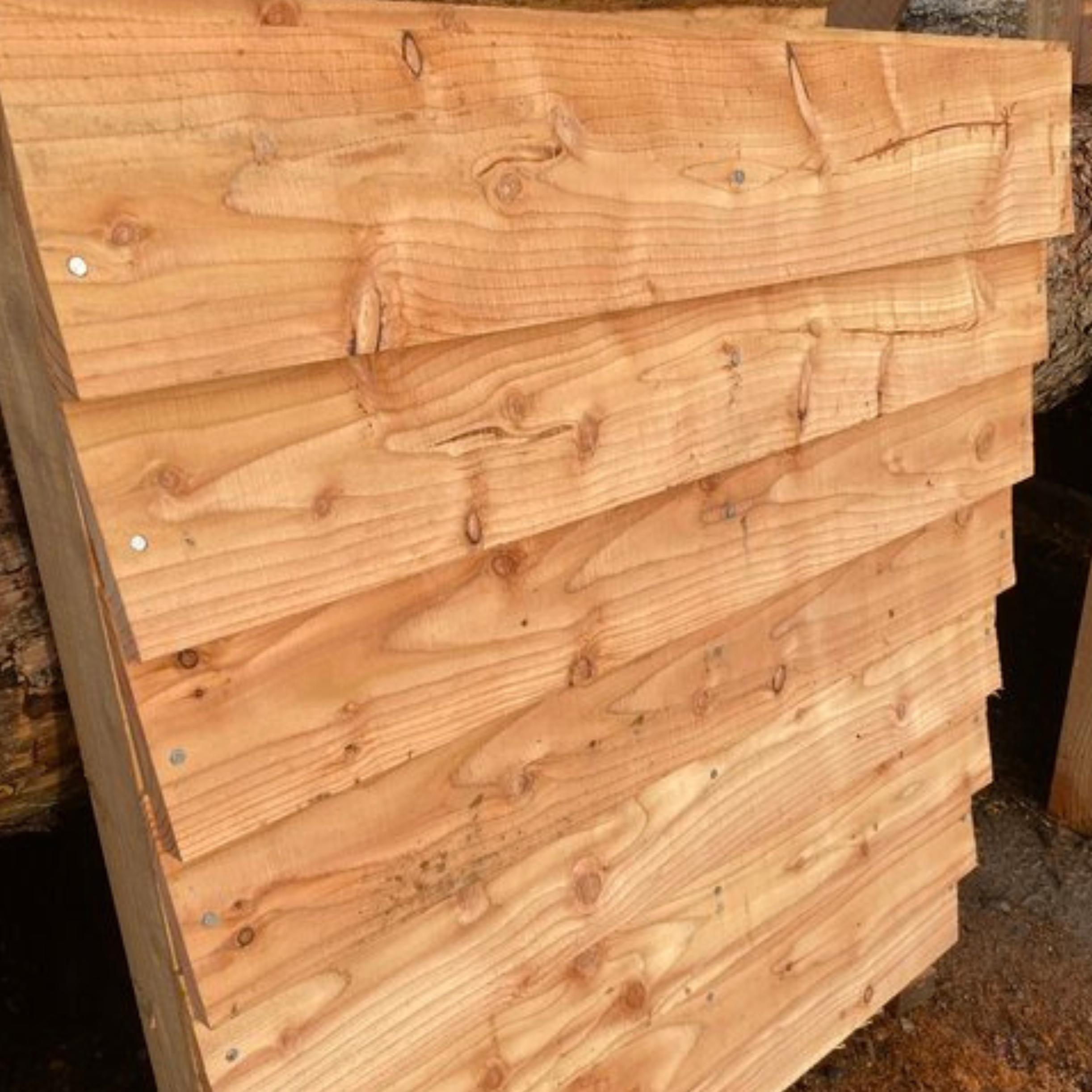 A horzontal cladding made with one square edge and one live edge 20mm thick and varying widths depending on the size of log. Like featheredge this is fitted with an overlap. Waney edge adds character and a rustic feel to your project.